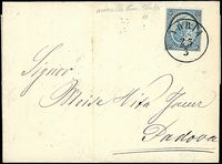 Base d'asta: EUR 400,00 Dettaglio Lotto Fai un'offertaLotto 609ITALIA REGNO 1867 - ADRIA (23/3 - p. 4) su lettera c.d.t. affrancata con ferro di cavallo II tipo (25) per Padova - Interessante uso dell' annullo di Lombardo Veneto su Regno4 Tempo rimanente:
