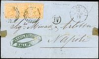 Base d'asta: EUR 130,00 Dettaglio Lotto Fai un'offertaLotto 618ITALIA REGNO 1877 - 20 c. ocra arancio (28) in coppia + singolo su lettera in triplo porto da Gallipoli (12/2/79) a Napoli4 Tempo rimanente: