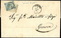 Base d'asta: EUR 500,00 Dettaglio Lotto Fai un'offertaLotto 605ITALIA REGNO 1866 - 20 c. su 15 c. celeste chiaro, I tipo (23) su lettera con annullo a numerale e punti 28 da Torino (1/5/66 - 1° giorno uso annullo a punti) a Genova - Interessante4 Tempo rimanente: