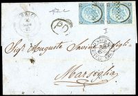Base d'asta: EUR 150,00 Dettaglio Lotto Fai un'offertaLotto 606ITALIA REGNO 1866 - 20 c. su 15 c. celeste chiaro, I tipo (23) in coppia su lettera da Lerici (26/7/66) a Marsiglia - Cert. Vicario4 Tempo rimanente: