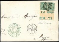 Base d'asta: EUR 500,00 Dettaglio Lotto Fai un'offertaLotto 611ITALIA REGNO 1867 - 20 c. celeste chiaro, con dentellatura fortemente spostata in basso (L26ca) SPL con b.f. in basso su lettera da Milano (28/11/67) a Villafranca Veronese - Non comune! - Cert. E. Diena per esteso + sigla AD (2.000,00)4 Tempo rimanente: