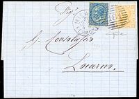 Base d'asta: EUR 1.800,00 Dettaglio Lotto Fai un'offertaLotto 617ITALIA REGNO 1877 - 10 c. azzurro (27) + 20 c. ocra arancio (28) SPL su lettera da Milano (31/12/77) a Locarno - Non comune - Cert. Vicario4 Tempo rimanente: