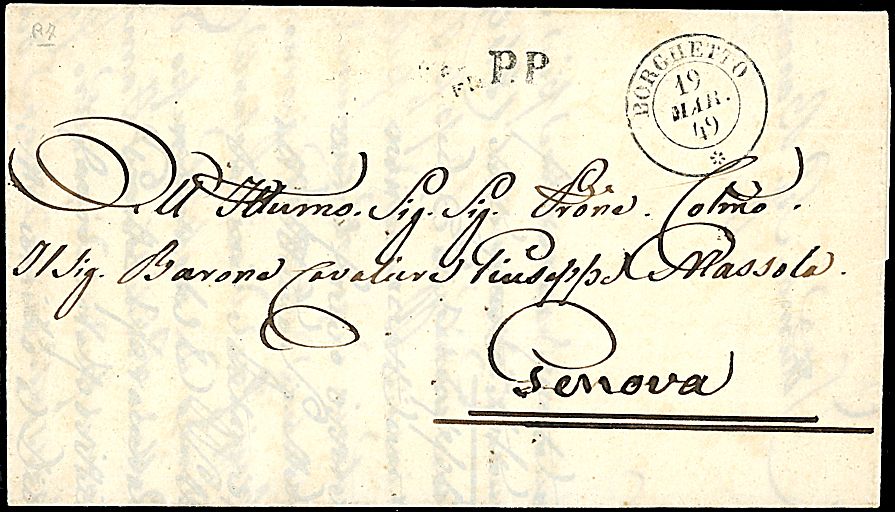 1849 - Lettera c.d.t da BORGHETTO (19/3/49) a Genova con bollo PP
