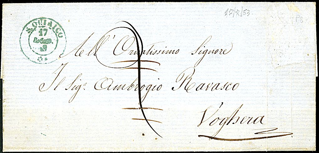 1850 - Lettera c.d.t. da S. QUIRICO in azzurro verdastro (17/7/53 - p. 8++) a Voghera, tassata e poi detassata - Interessante