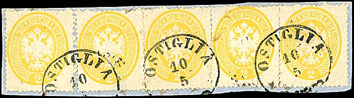 1863 - 2 s. giallo, dent. 14 (36) 5 val. su frammento annullato OSTIGLIA - Sigla AD