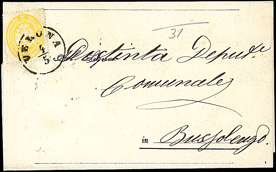 1863 - 2 s. giallo, dent. 14 (36) SPL su circolare da Verona (4/5/65) a Bussolengo (1.000,00)