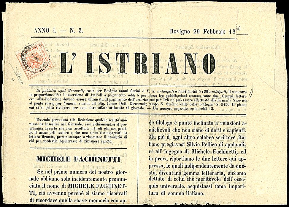 1858 - 4 kr. rosso smorto (4) SPL su giornale L'ISTRIANO da Rovigo (29/2/60) probabilmente diretto a Venezia - Raro! - Cert. Sorani (62.500,00)
