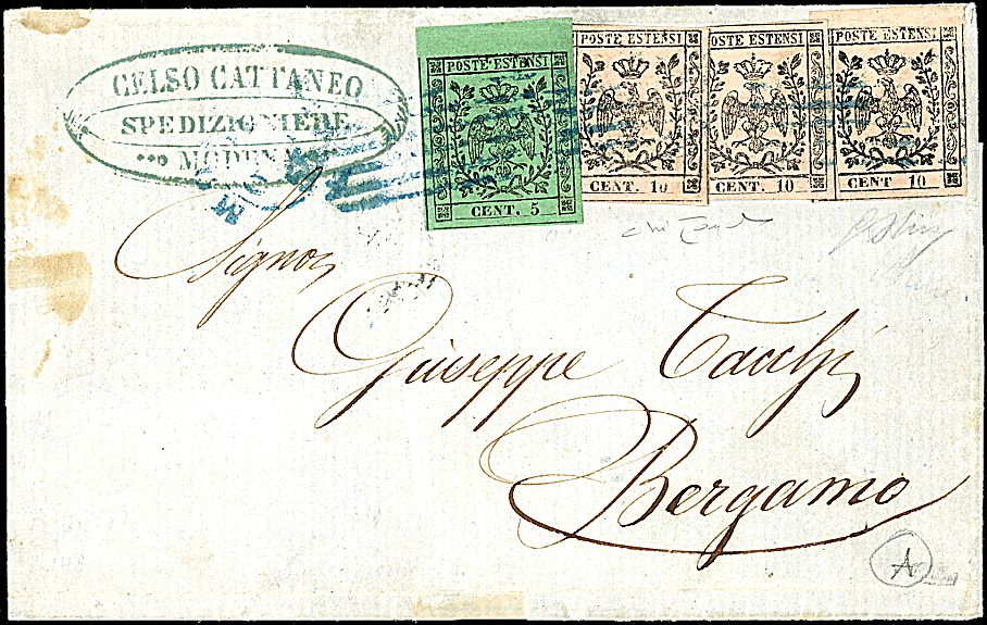 1852 - 5 c. verde (1) due val. di cui uno al verso strappato per aprire la lettera + 10 c. rosa chiaro (2) tre val. di cui uno senza punto CENT (2b) su lettera da Modena (10/10/55) a Bergamo - Cert. Ray + sigla Oliva (9.400,00 senza contare quello rotto)