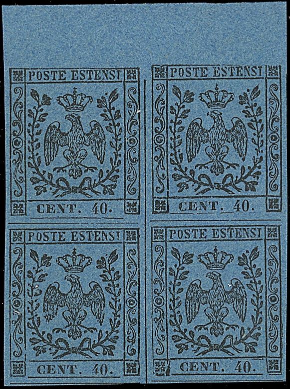1852 - 40 c. azzurro scuro (10) in quartina SPL, con gomma integra e b.f. in alto - Cert. RD del blocco di provenienza (880,00+)