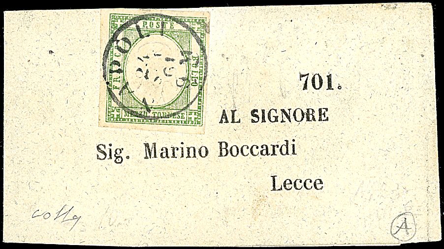 1861 - 1/2 t. verde (17) SPL e ben marginato su fascetta da Napoli (24/9/61) a Lecce - Cert. Colla