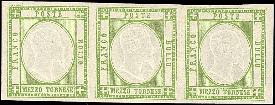 1861 - 1/2 t. verde giallo (17e) in striscia di 3 SPL con gomma integra - Cert. Manzoni (350,00)