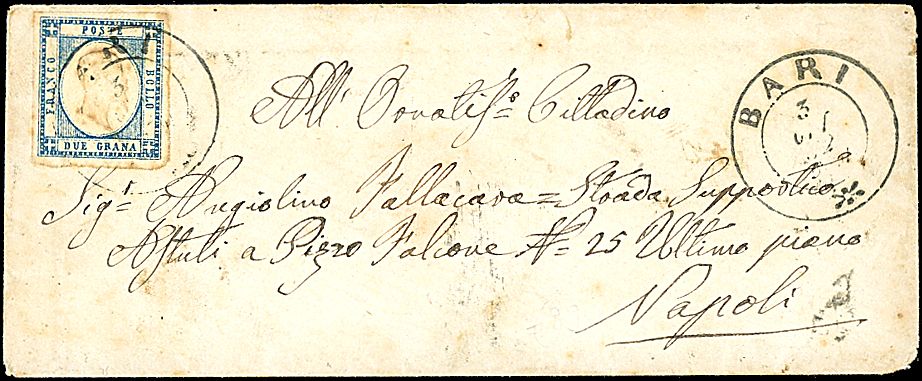 1861 - 2 gr. azzurro chiaro (20) BB su busta da Bari (3/10/62) a Napoli - Raro uso tollerato dopo l'introduzione dei francobolli di Regno