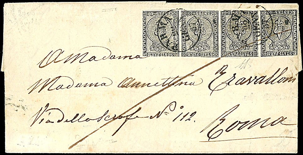 1857 - 10 c. bianco (2) in striscia orizzontale di 4 con margini insufficienti su lettera da Parma (22/1/57) a Roma - Rara! - Cert. Oliva + cert. Cardillo (40.000,00)