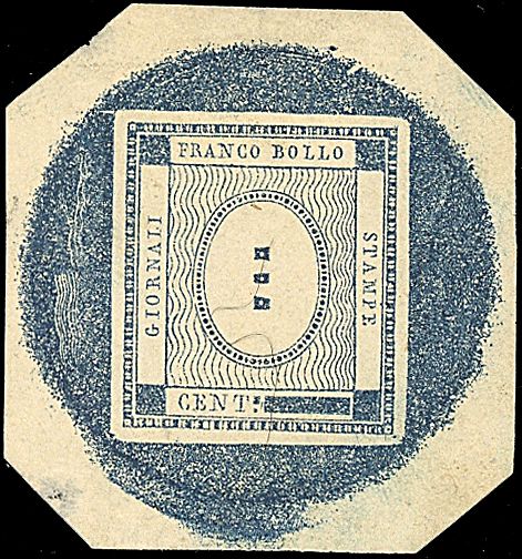 1860 - Francobolli per Stampati - Prova di conio senza indicazione del valore in colore azzurro ardesia su carta sottile non gommata - Rarissima ed esposta a Monacophil - Cert. Manzoni + cet. Cardillo