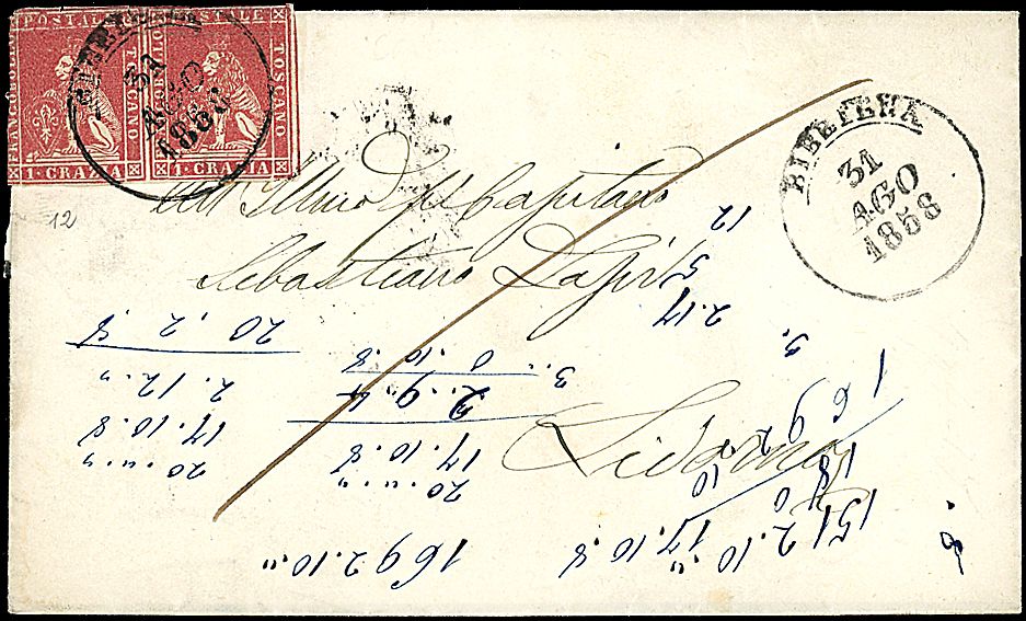 1857 - 1 cr. carminio (12) in coppia difettosa su lettera da Bibbiena (31/8/58) a Livorno - Rara - Cert. Manzoni (9.000,00)