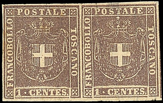 1860 - 1 c. bruno lilla (17b) in coppia ben marginata ma leggermente assottigliata - Cert. Ray (16.000,00)