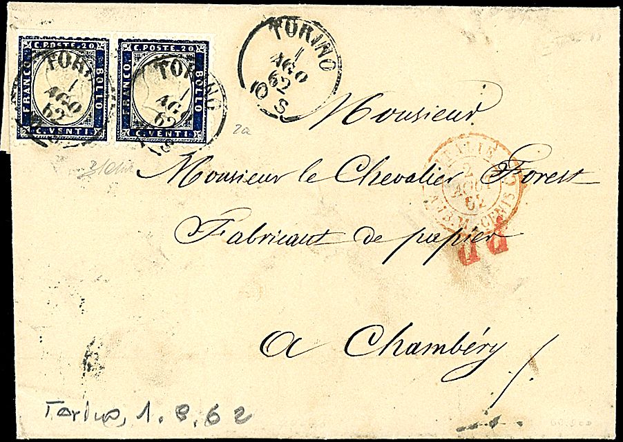 1862 - 20 c. indaco con riflessi violacei (2a) in coppia SPL su lettera da Torino (1/8/62) a Chambery - Sigla Oliva (500,00)