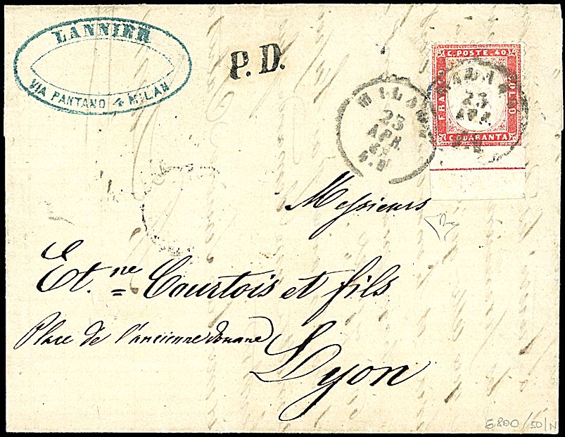 1863 - 40 c. rosso carminio, non dentellato in basso con b.f. integrale e linea di riquadro (3l) SPL su lettera da Milano (23/4/63) a Lione - Rarissima e di splendida qualità! - Cert. E. Diena per esteso - Ex collez. Provera (45.000,00)
