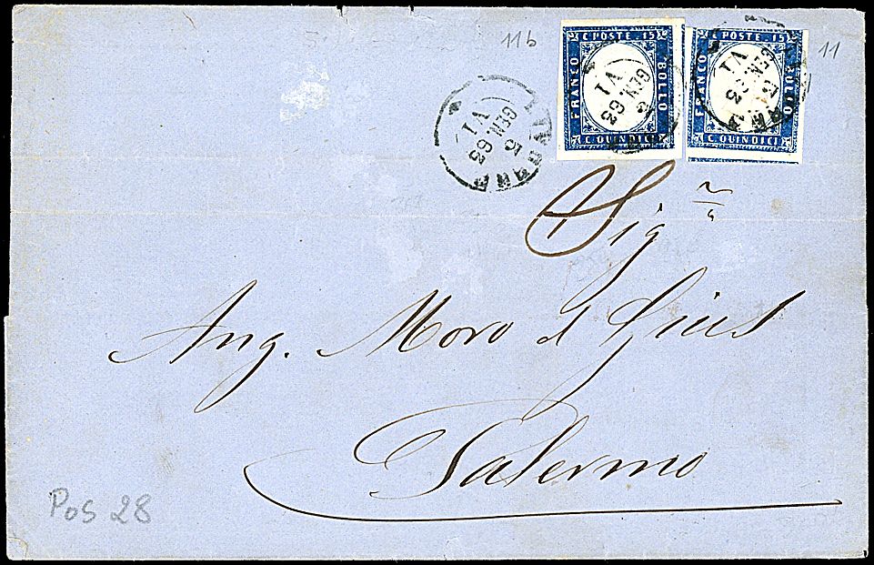 1863 - 15 c. azzurro (11) + 15 c. azzurro scuro (11b) SPL su lettera da Livorno (5/1/63 - 3° giorno d'uso) a Palermo - Interessante
