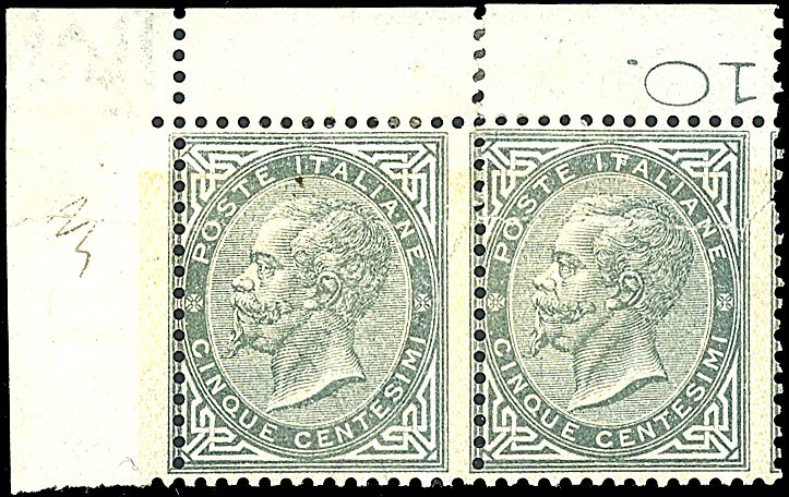 1865 - 5 c. grigio verde (L16) in coppia con varietà carta ricongiunta applicata prima della perforazione - Rarissima varietà con a.f. - Cert. Colla per esteso
