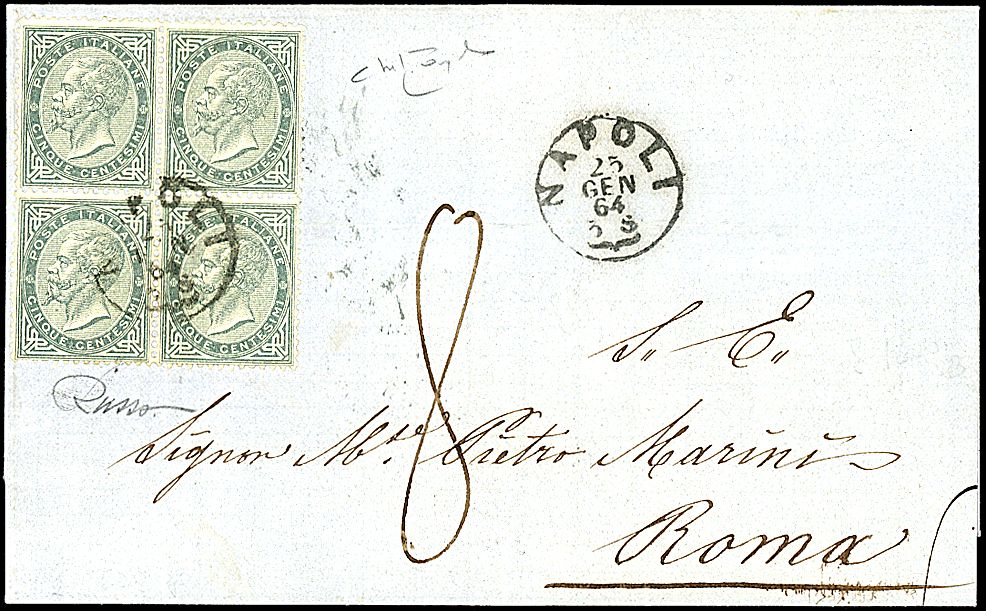 1863 - 5 c. grigio verde (L16) in quartina SPL su lettera da Napoli (25/1/64) a Roma - Cert. Ray (1.650,00)