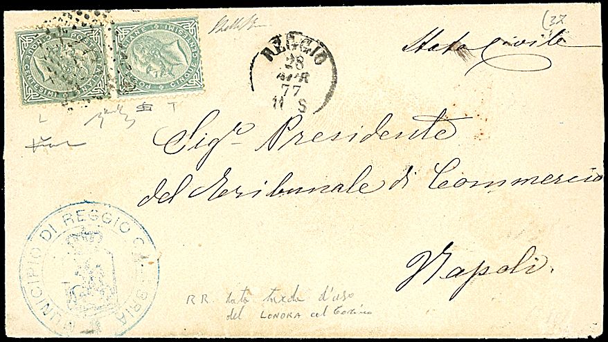 1877 - 5 c. grigio verde (L16) + 5 c. verde grigio scuro (T16) SPL in affrancatura gemella su lettera da Reggio (28/4/77) a Napoli - Non comune - Cert. Vicario + sigle Gazzi + Chiavarello