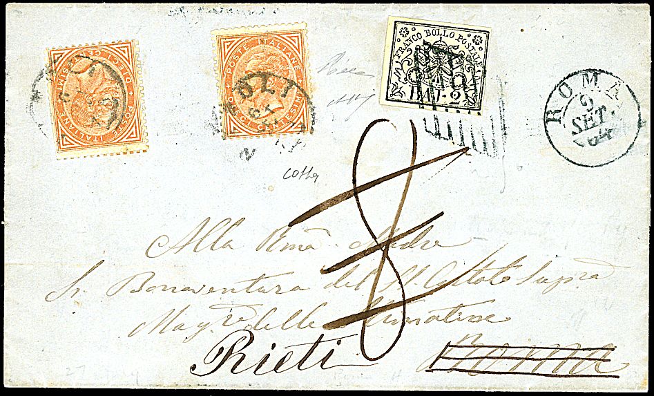 1863 - 10 c. ocra arancio (L17) due val. SPL su lettera da Napoli (6/9/64) a Roma, dove fu tassata e poi detassata in quanto affrancata per la respedizione del nuovo tratto Roma-Rieti con Pontificio 2 b. bianco verdastro (3Aa) Pregevole affrancatura mista - Cert. Colla + cert. RD