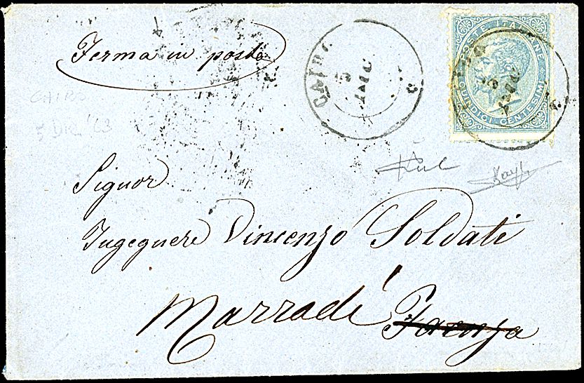 1863 - 15 c. celeste chiaro (L18) BB su busta da Cairo (5/12/63 - 1° mese d'uso) a Marradi - Non comune - Cert. Vicario + sigla Ray