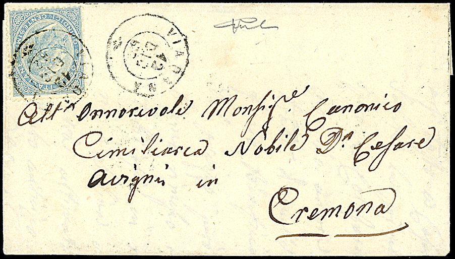 1863 - 15 c. celeste chiaro (L18) BB su busta da Viadana (12/12/63 - 1° mese d'uso) a Cremona - Non comune - Cert. Vicario