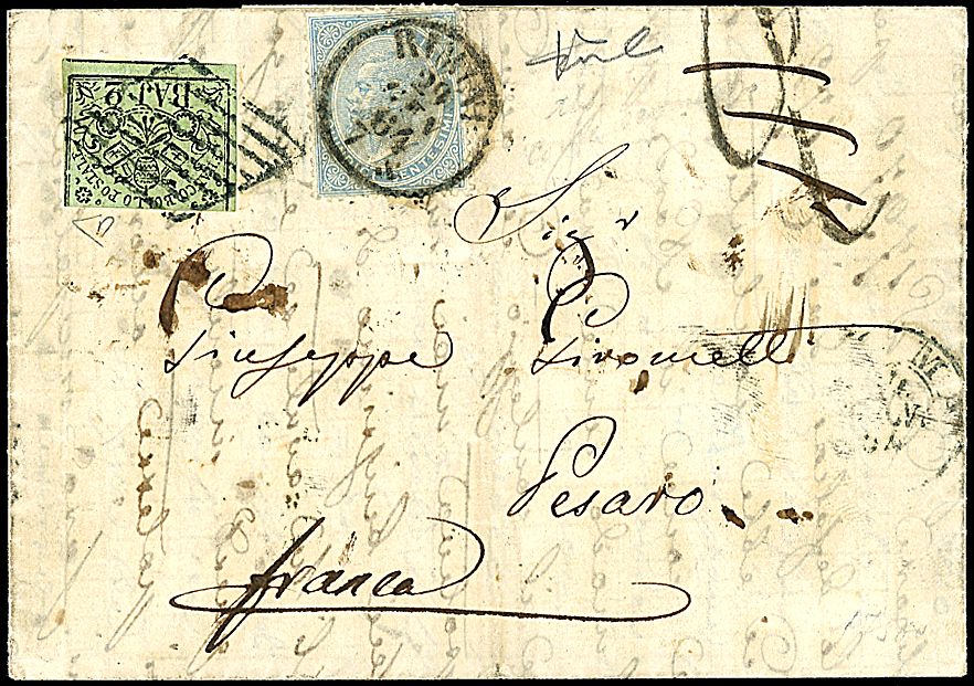 1864 - 15 c. celeste chiaro (L18) + pontificio 2 b. verde oliva (3) In partenza fu annullato il solo francobollo dello Stato Pontificio e in arrivo non fu ritenuto valido quello da Cent. 15 del Regno d’Italia. Quindi venne tassato come di consuetudine per 2 decimi di Lira (manoscritto). Fu così che il destinatario non volle pagare la tassa e ritirare la missiva che rimase alcuni giorni in giacenza ed inviata a Rimini, dove venne ritenuto valido il francobollo da 15c e per questo tolta la tassa - Fu quindi rispedito a Pesaro e ritirato dal destinatario - Rara! - Cert. ED + cert. Vicaio