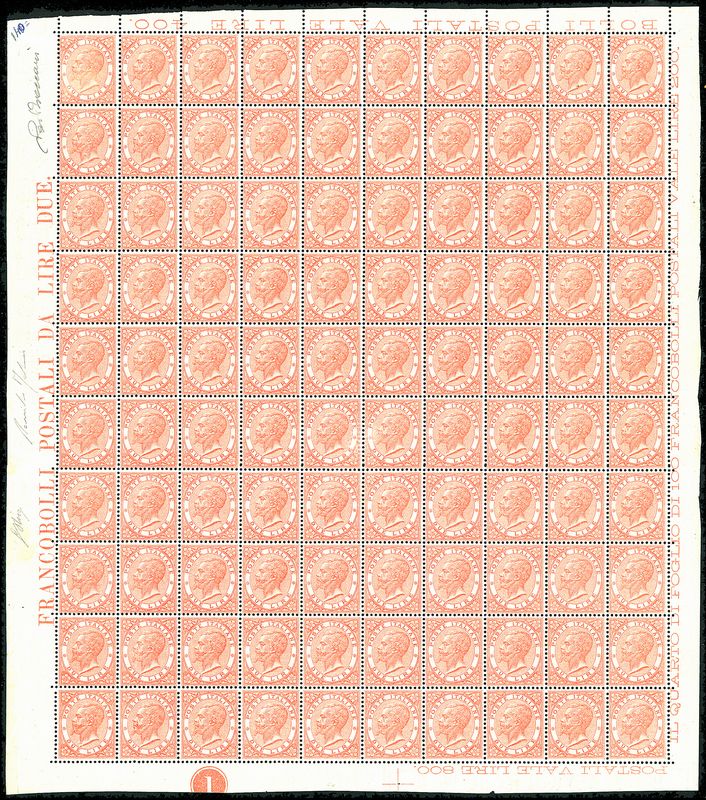 1863 - L. 2 scarlatto, tir. di Londra (L22) Foglio cpl. 100 esemplari SPL di buona/ottima centratura e num. 1 di tavola - Raro! - Cert. Vaccari + cert. RDiena per esteso + cert. Fabris (204.000,00+)