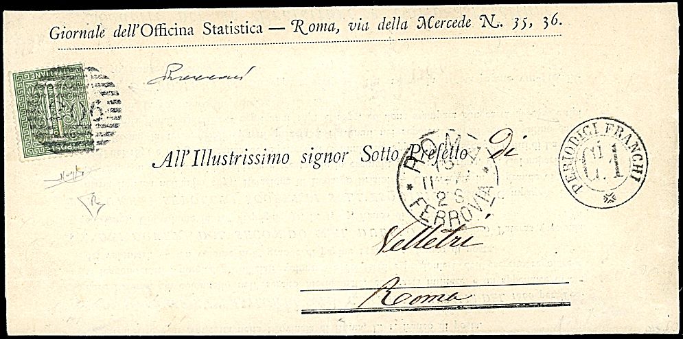 1877 - Circolare affrancata in combinazione gemella con bollo a doppio cercgio Periodici Franchi C.i 1 + 1 c. verde oliva (T14) da Roma (15/11/77) a Velletri - Non comune - Cert. E. Diena per esteso + sigle Ray + Vaccari