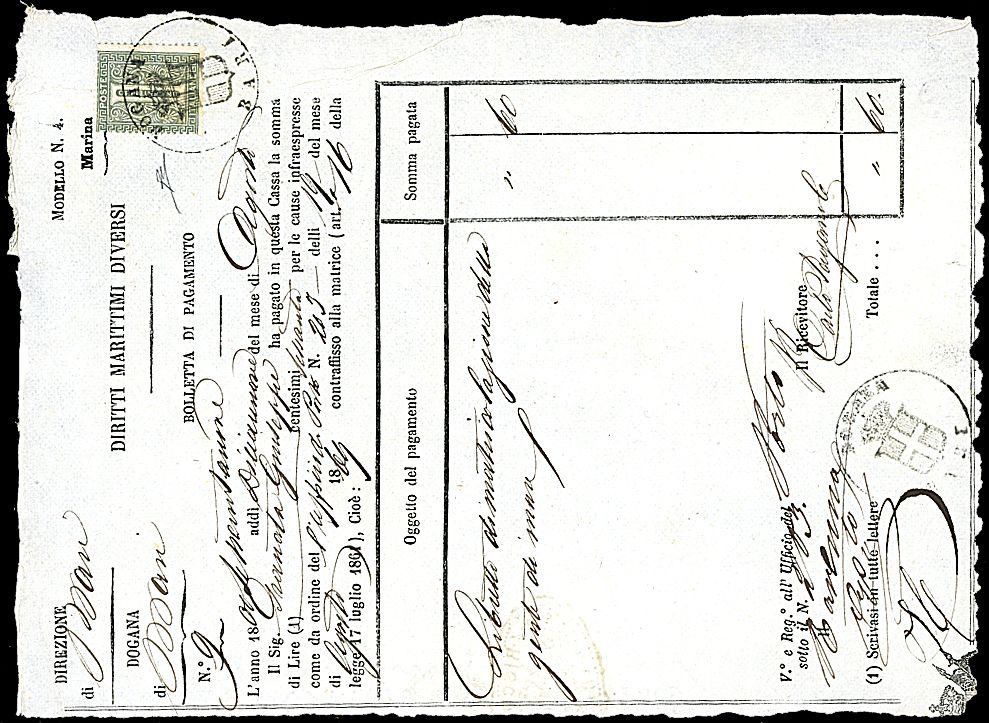1864 - 1 c. verde oliva (T14) su bolletta di pagamento diritti marittimi annullato Dogana Bari - Sigla RD