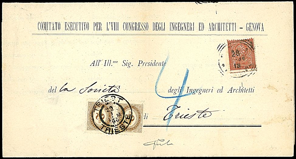 1896 - 2 c. rosso mattone (T15) BB su lettera da Genova (28/1/96) a Trieste dove fu tassato per 4 kr. come da indicazioni sulla lettera - Cert. Vicario