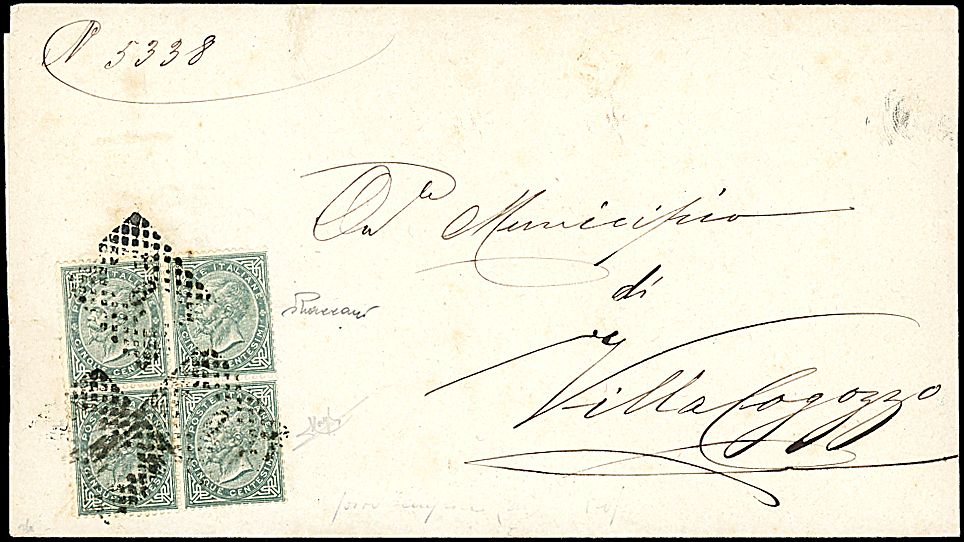 1876 - 5 c. verde grigio scuro (T16) in quartina SPL su lettera da Carcina (17/11/76) a Villa Cogozzo - Cert. Toselli + sigle Ray + Vaccari (475,00)