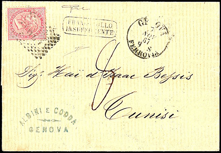1867 - 40 c. rosso carminio (T20) SPL su lettera da Genova (7/11/67) a Tunisi - Bollo Francobollo insufficiente + bollo di arrivo - Cert. Vicario + sigla RD