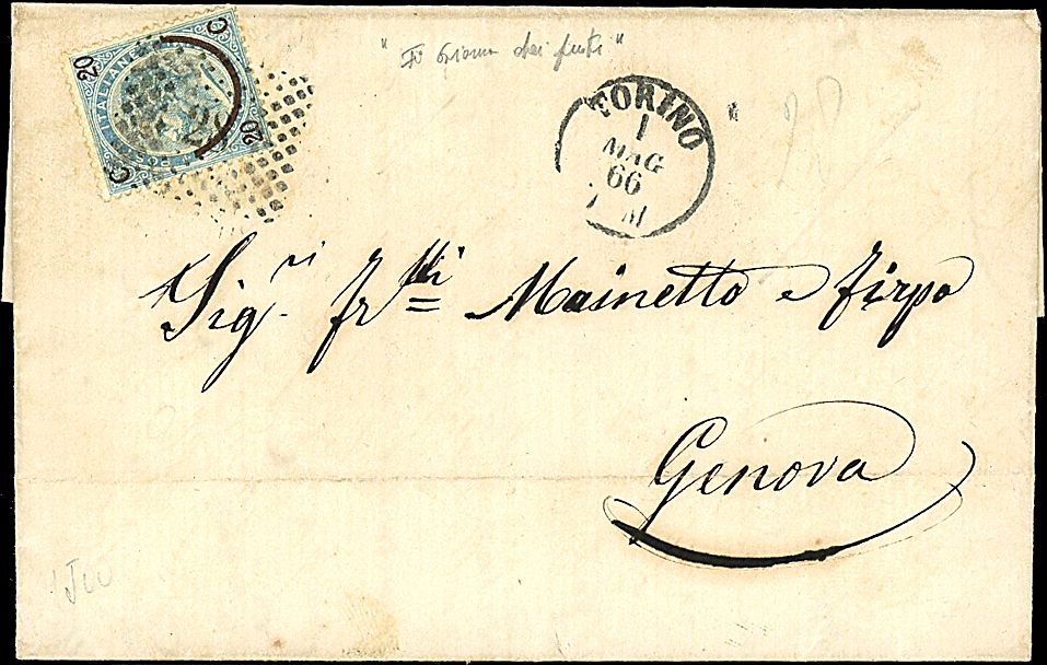 1866 - 20 c. su 15 c. celeste chiaro, I tipo (23) su lettera con annullo a numerale e punti 28 da Torino (1/5/66 - 1° giorno uso annullo a punti) a Genova - Interessante