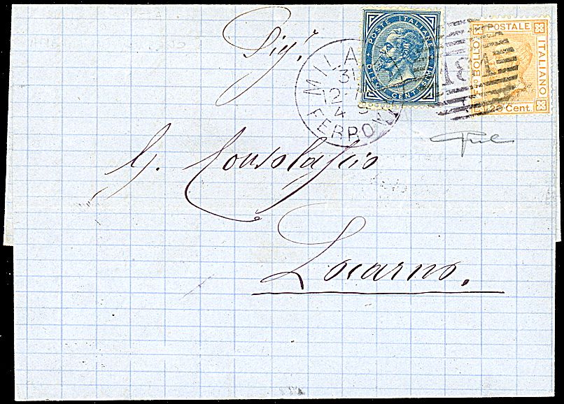 1877 - 10 c. azzurro (27) + 20 c. ocra arancio (28) SPL su lettera da Milano (31/12/77) a Locarno - Non comune - Cert. Vicario