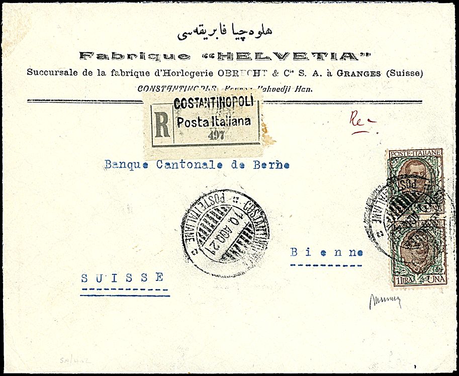 1921 - Floreale - L. 1 bruno e verde (77) in coppia su busta da Costantinopoli (10/8/21) a Bienne - Interessante