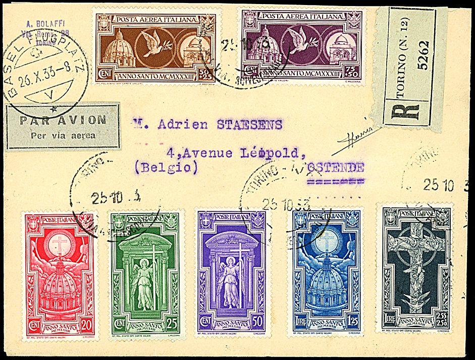 1933 - Anno Santo (345/349+A) Serie cpl. 7 val. SPL su busta da Torino (25/10/33) a Ostenda - Sigla Sorani (2.100,00)