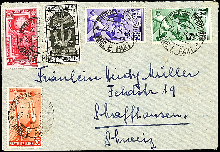 1934 - Lettera da Firenze (22/7/34) per la Svizzera con bella affrancatura del Calcio + altri