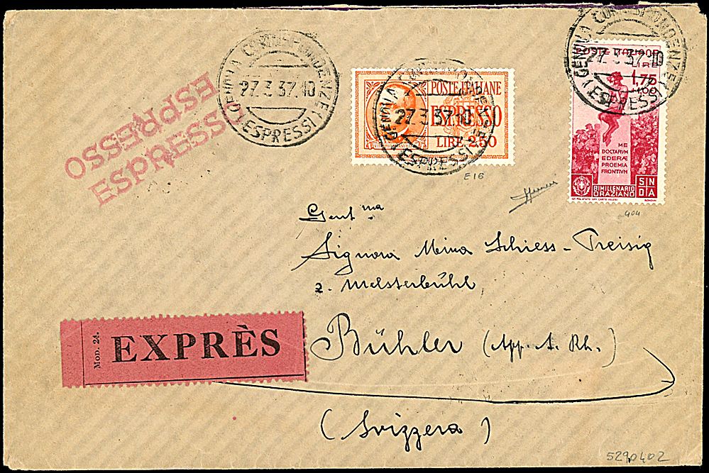 1936 - Orazio - L. 1,75 carminio (404) + espresso L. 2,50 arancio (16) entrambi SPL su busta da Genova (27/3/37) a Buhler - Svizzera - Sigla Sorani (1.200,00)