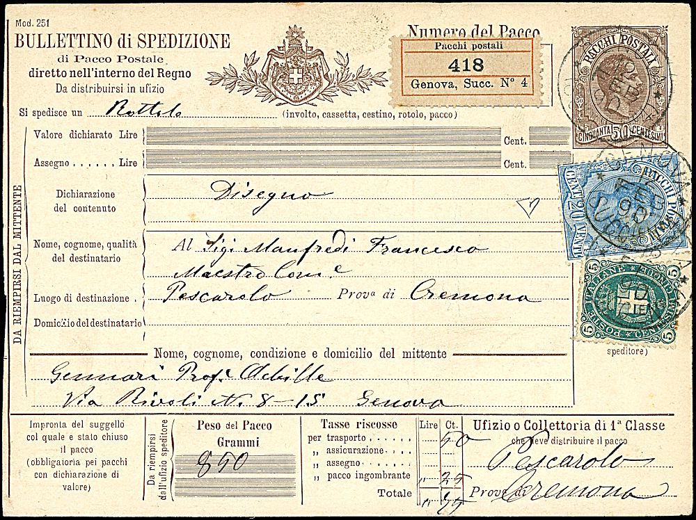 1890 - Umberto I - Bollettino di spedizione da 50 c. bruno + 20 c. azzurro (2) + stemmi 5 c. verde (44) da Genova (12/2/90) a Pescarolo - Raro! - Sigla ED (5.500,00+)
