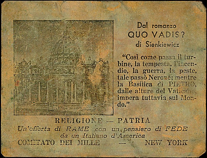 1936 - Comitato dei Mille - New York - Cartolina di rame utilizzata per inviare in Italia il prezioso metallo utile in tempi di guuerra - Non comune
