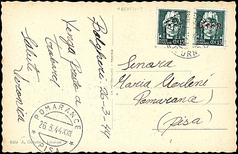 1944 - GNR - 15 c. verde grigio (472) + Imperiale 15 c. verde grigio (246) su cartolina da Bolgheri (26/3/44) a Pomarance - Bollo di arrivo - Raro uso dei valori gemelli
