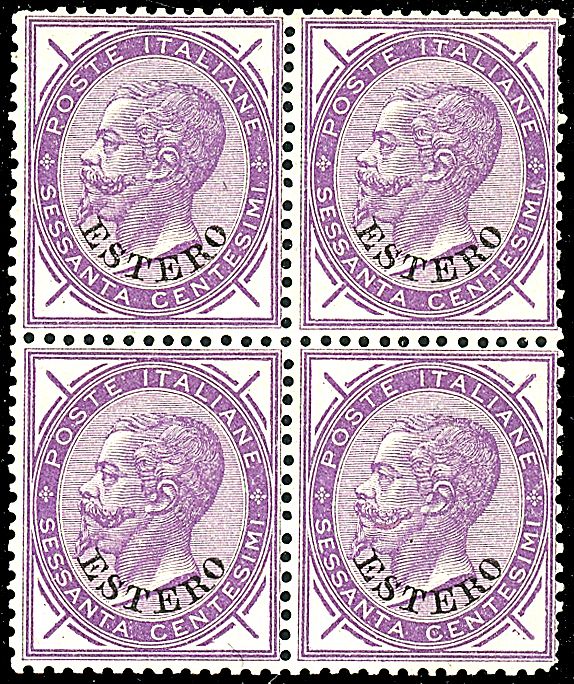 1874 - 60 c. lilla (8) in quartina SPL e ben centrata - Cert. RD (600,00)
