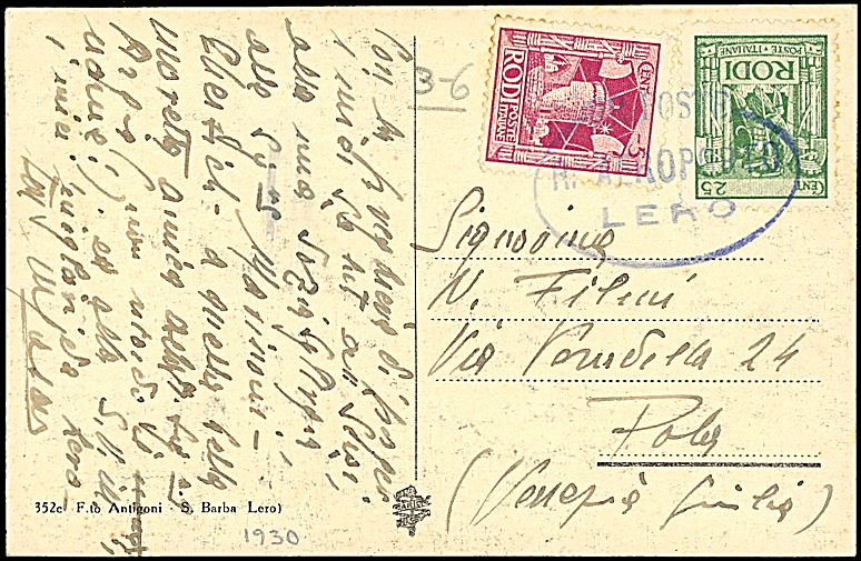 1929 - 5 c. lilla rosa (3) + 25 c. verde (6) su cartolina da Lero a Pola