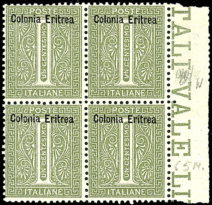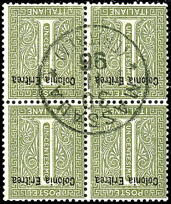 1893 - 1 c. verde oliva, tir. Torino (1) due quartine SPL, una integra ben centrata e con b.f. ed una usata
