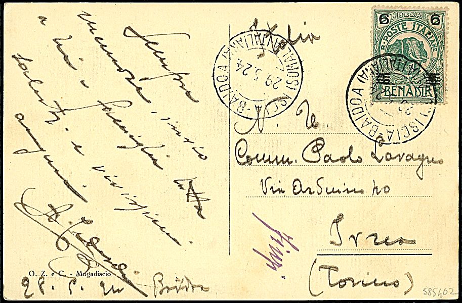 1924 - 6 b. su 5 c. su 2 b. verde (38) su cartolina da Iscia-Baidoa (29/5/24) ad Ivrea (240,00)