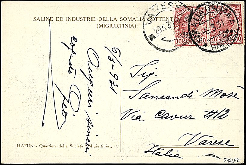 1931 - 10 c. rosa (94) in coppia su cartolina da Hafun (6/3/31) a Varese - Bollo di arrivo - Non comune